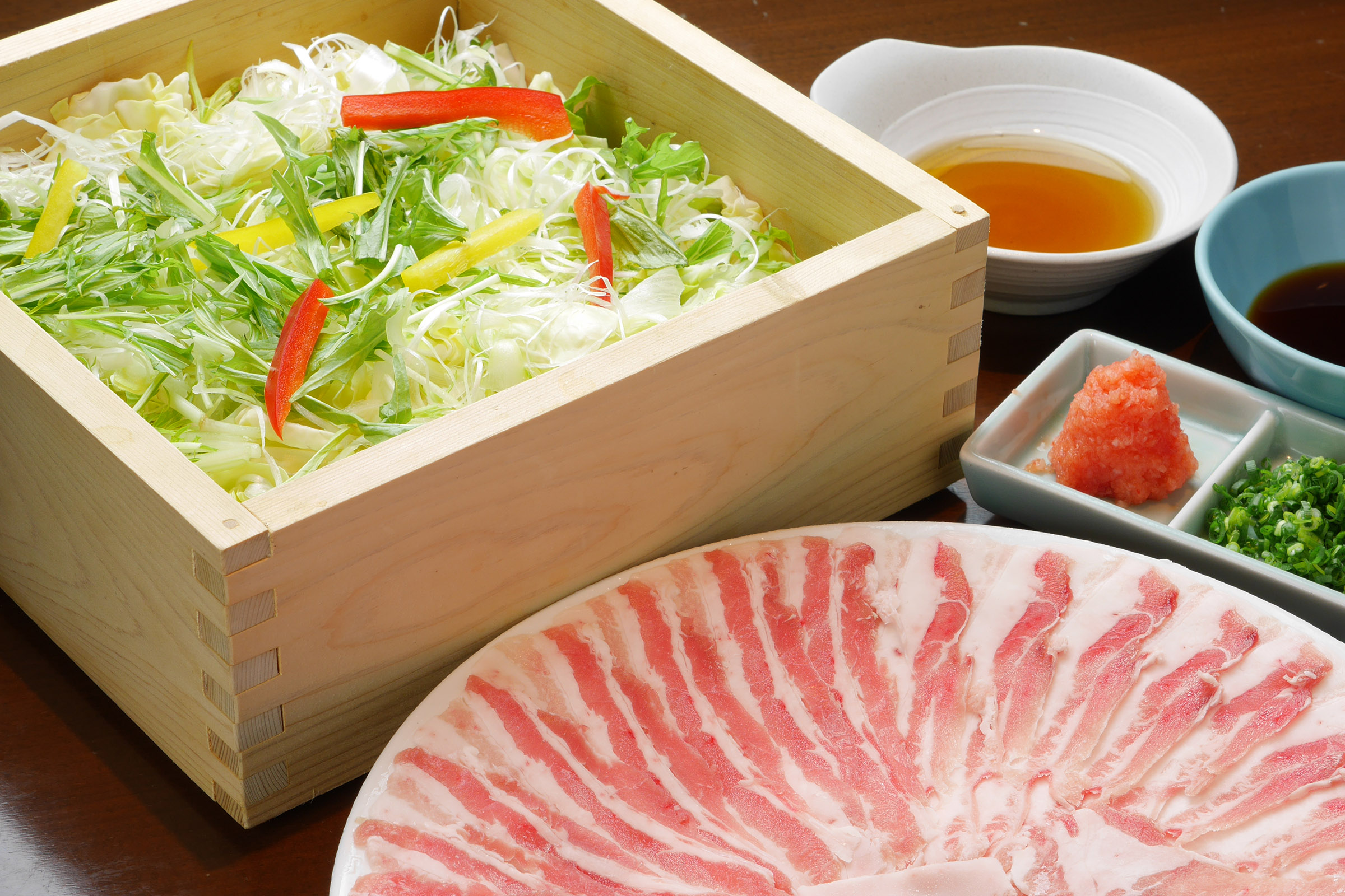 職人が丁寧に仕上げる季節の旬彩や逸品料理や特製の和風出汁で頂く名物「黒豚しゃぶしゃぶ」、「しゃぶすき」や「トマトチーズカレー鍋」までお楽しみ頂ける。A5等級の黒毛和牛や日南どりに加え、旬菜盛り合わせや市場直送の獲れたて鮮魚のお造り盛り合わせ、焼き物など旬を盛り込んだ華やかな逸品を数多く取り揃えております。季節感のあるお料理とお料理に合わせたお飲み物も各種ご用意しております。ランチには開放的な空間を、ディナータイムは落ち着いた雰囲気の個室空間を用途に合わせておつくりしております。